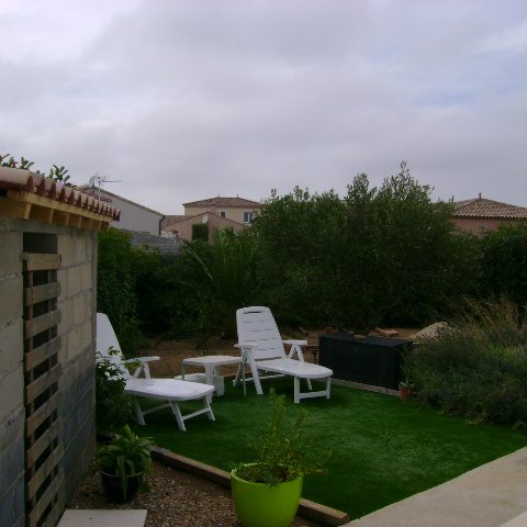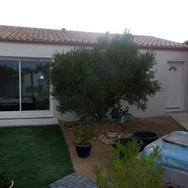 Afin d’ajourer l’espace détente, une baie vitrée donne accès sur un petit jardin couronnée en son centre d’un olivier avec deux chaises longues…