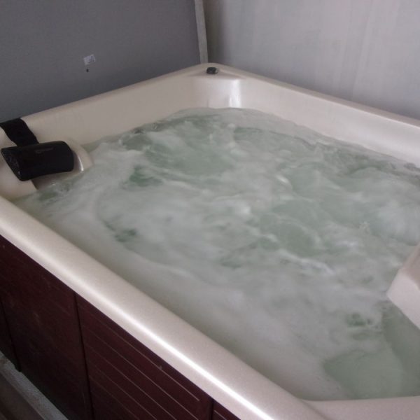 Pour l’intégration du jacuzzi, une excavation dans la dalle a permis d’encastrer et de respecter la côte à + 50 cm. En fond, un caniveau périphérique entoure le jacuzzi, le tout relié à une pompe de relevage.